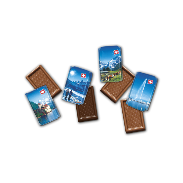 Opakowania miniczekoladek ilustrowane widokami Szwajcarii w kilku wersjach.